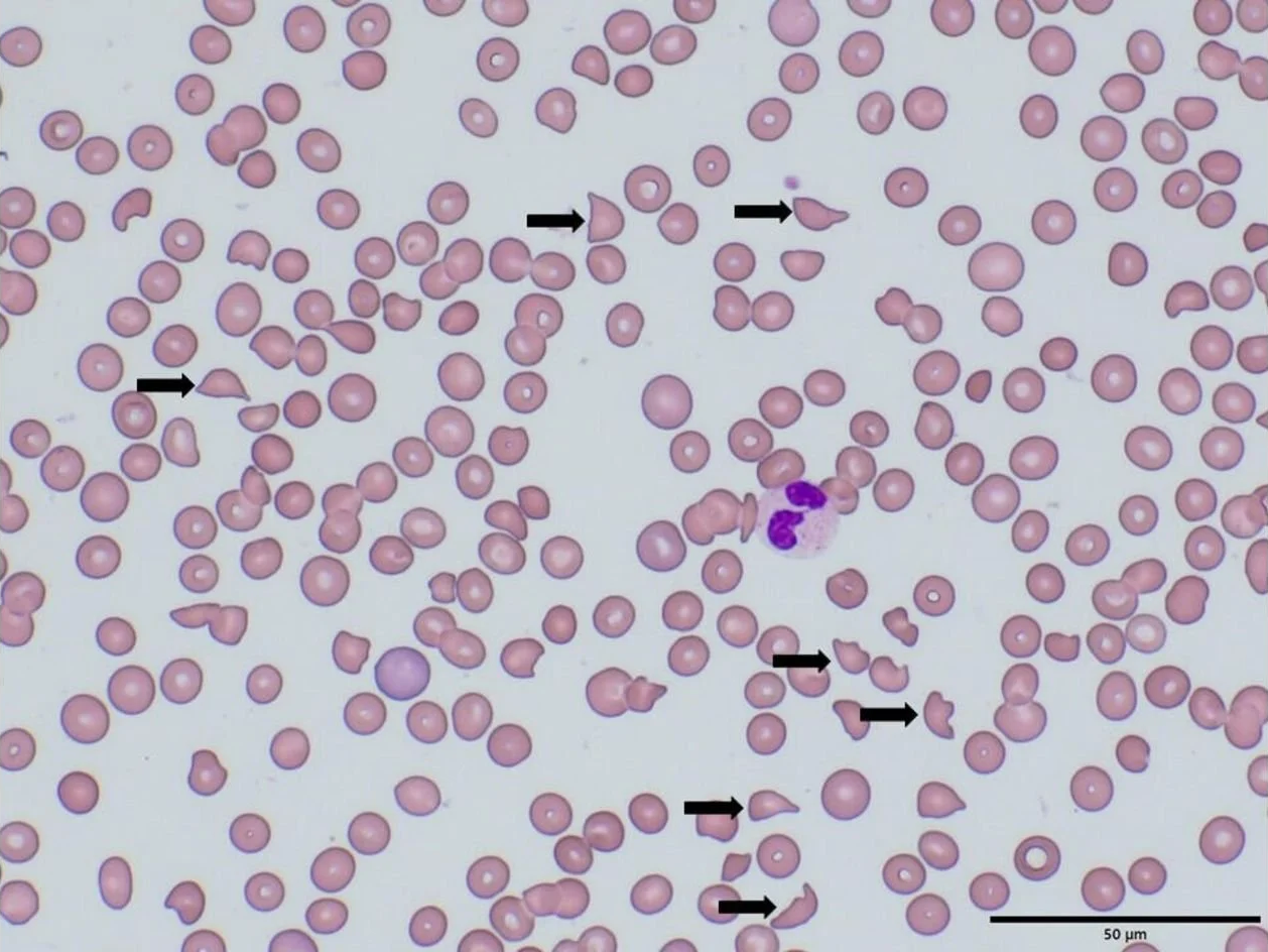 Film: Slight anisocytosis. Moderate poikilocytosis, shistocytes and helmet cells. Occastonal myelocytes and metamyelocytes. | ||||