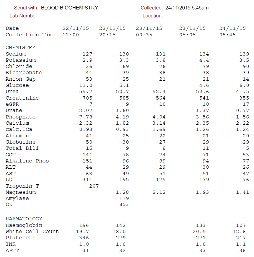 | Bicarbonate | 41 | mmol/L | (22-32) | |