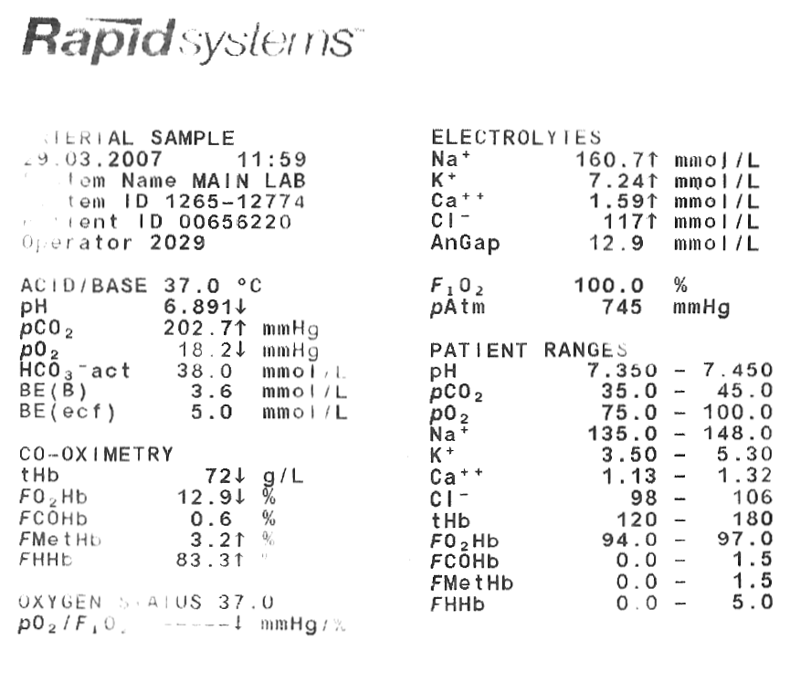 | ABG | pH | 6.89 | (7.36-7.44) | |